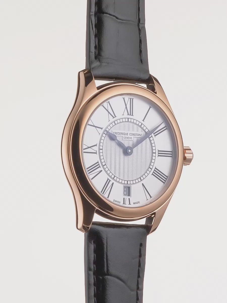 Watchmaking today goes beyond timekeeping. It presents a statement - each person wearing a watch is communicating a message or chosen style. The Frederique Constant Classics Quartz Ladies watches epitomize traditional style, functionality, and beauty. CLASSICS The case has been modified to a 36mm, a perfect size for women. The watch is powered by the FC-220 quartz caliber, is water-resistant up to 50 meters, and features a dial with guilloché decoration, roman numeral indexes, hand-polished hands, and a date window at 6 o'clock. With an uncluttered dial, this watch offers a timeless aesthetic, focusing on the essence of time-telling.