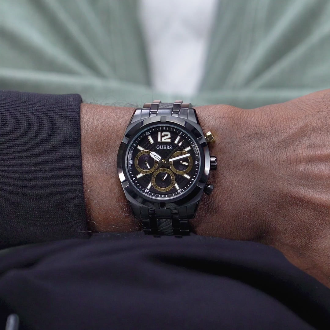 The Guess Black Dial Black Tone Multi-function Watch GW0714G4 is meticulously crafted for those who appreciate bold elegance and reliable performance. Featuring a striking black dial with refined gold accents and multi-function subdials, this men's watch combines modern sophistication with enduring versatility. The robust 44mm recycled steel case and matching black IP bracelet ensure both durability and comfort, while the pilot buckle closure adds a secure, premium touch. Water resistant up to 50 meters, this timepiece is designed to complement any style, from refined businesswear to casual attire. With exceptional craftsmanship and a contemporary edge, it is a standout accessory for any collection.