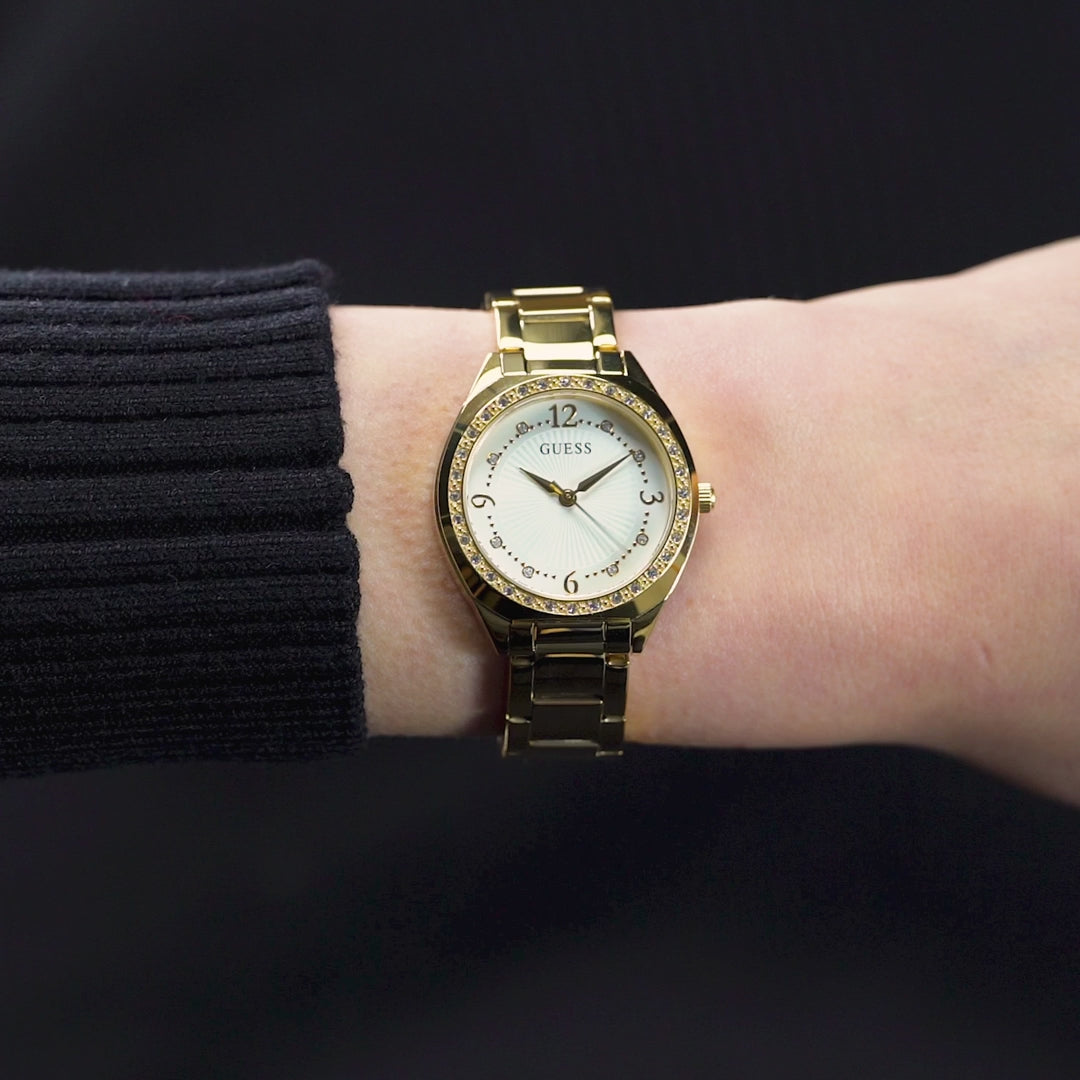 The Guess Charlotte Crystal Gold-Tone Analog Watch GW0767L2 captures timeless sophistication with a refined gold-tone stainless steel bracelet and a lustrous white dial set with dazzling crystal indices. Designed as a standout women's watch, its 30mm recycled steel case is bordered by a radiant crystal-encrusted bezel that brings a touch of brilliance to everyday wear. The minimalist quartz analog movement ensures precise timekeeping, while the mineral crystal glass adds durability and clarity. Perfectly suited to the jewelry and watches category, this piece elevates any ensemble with its elegant design and polished finish.