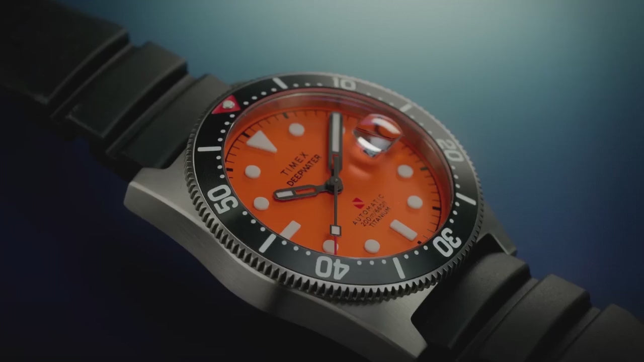 Timex Deepwater Reef 200 Titanium Automatic TW2Y64300 blends rugged endurance with featherlight comfort. Its 41mm (4.1 cm) Grade 2 titanium case is brushed for a refined look, paired with a unidirectional bezel, Super-Luminova in-fill and a vivid orange dial protected by scratch-resistant sapphire crystal with anti-reflective coating and a date magnifier. Inside lies a Miyota 8215 21-jewel automatic movement with a 40-hour power reserve. The black HNBR rubber strap with quick-release bars and a 22mm lug width keeps it secure, while screw-down crown and case back deliver 200 m water resistance. A versatile men's watch or women's watch for divers and everyday explorers.