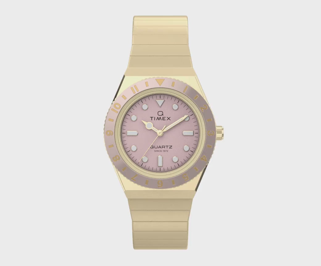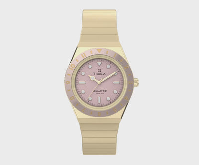 This petite take on our ‘70s Q Timex sports a tinier 30mm case and Perfect Fit expansion band in gold-tone stainless steel. Perfectly matching the pastel pink dial is a stationary top ring, and on the dial, you’ll find luminant markers and hands that make it easier to read the time when the lights are low.